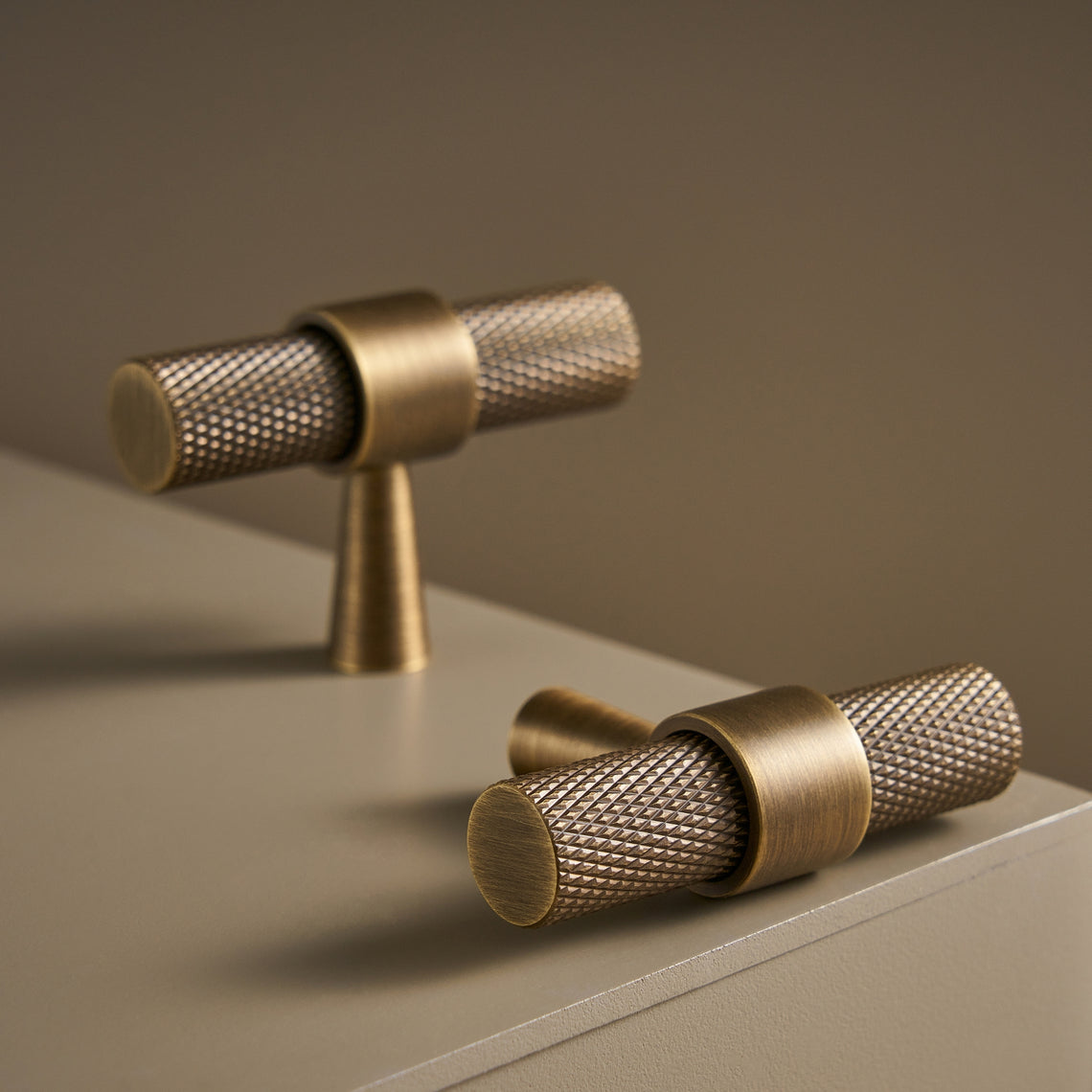 Exklusive T-Bar aus antikem Messing mit gerändelter Grifffläche – eine stilvolle Wahl für Küchenschränke, Badezimmermöbel und andere Möbel. Die robuste Messingkonstruktion verleiht eine luxuriöse Schwere, während die gerändelte Oberfläche sowohl Charakter als auch Funktion hinzufügt.